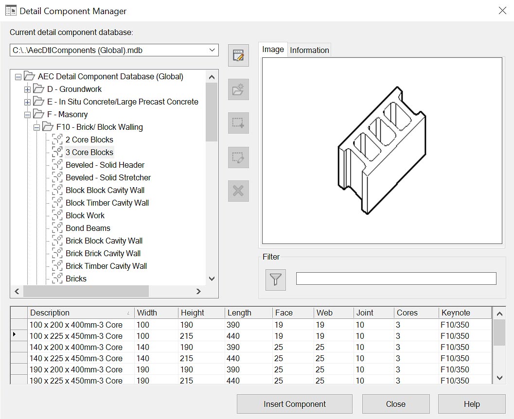 Use the Detail Component Manager dialog box to seamlessly navigate between different detail component databases. A hierarchical tree view and a filter feature make it easy to locate individual components within a database.