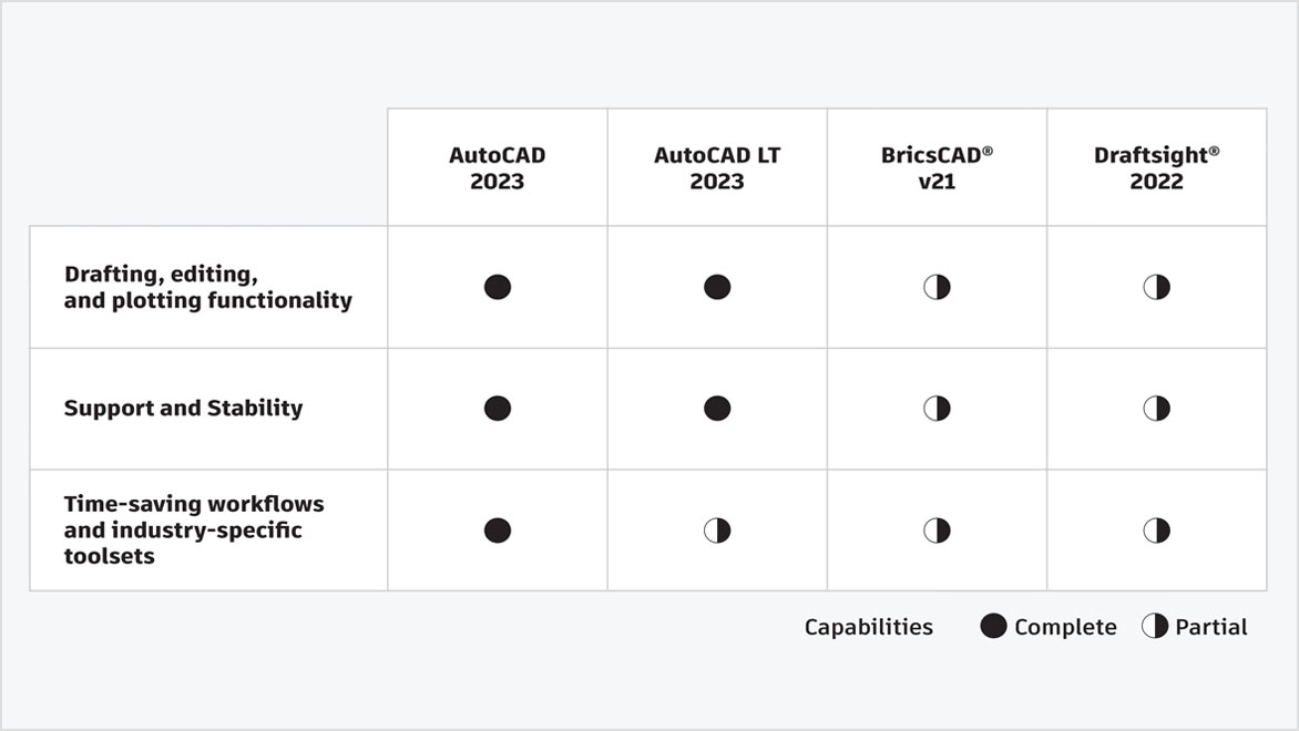 AutoCAD is best-in-class 2D and 3D drafting and design software, trusted by millions of users worldwide. No alternative CAD software has as many options to Improve your team's workflows. Here are six reasons to choose AutoCAD.
