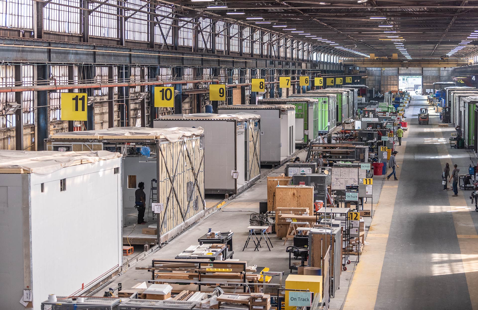 On the DMC continuum, a building can consist of any combination of standard components, subassemblies, panels, modules, and uber modules. Components are designed and fabricated in the controlled factory environment of the BLOX manufacturing facility (formerly a railcar plant) in Bessemer, AL, using repeatable processes and systems. “In a case where we have fewer and fewer skilled laborers, we’re creating systems that allow unskilled labor to do things that used to require skill,” Giattina says. “The skilled people shift to become the machine-makers,” creating processes and tools that can be used by other workers.