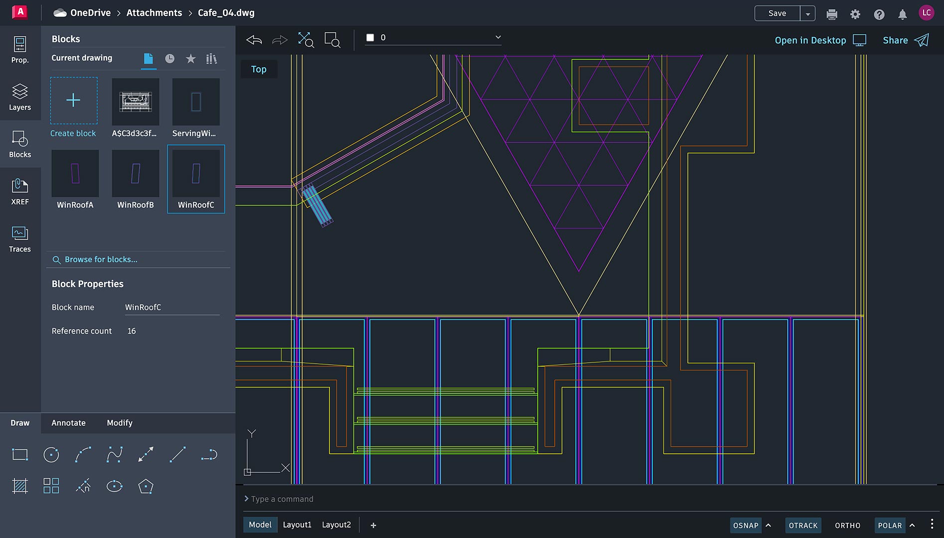 Create, insert, and modify blocks, as well as access block libraries directly from AutoCAD on the web.