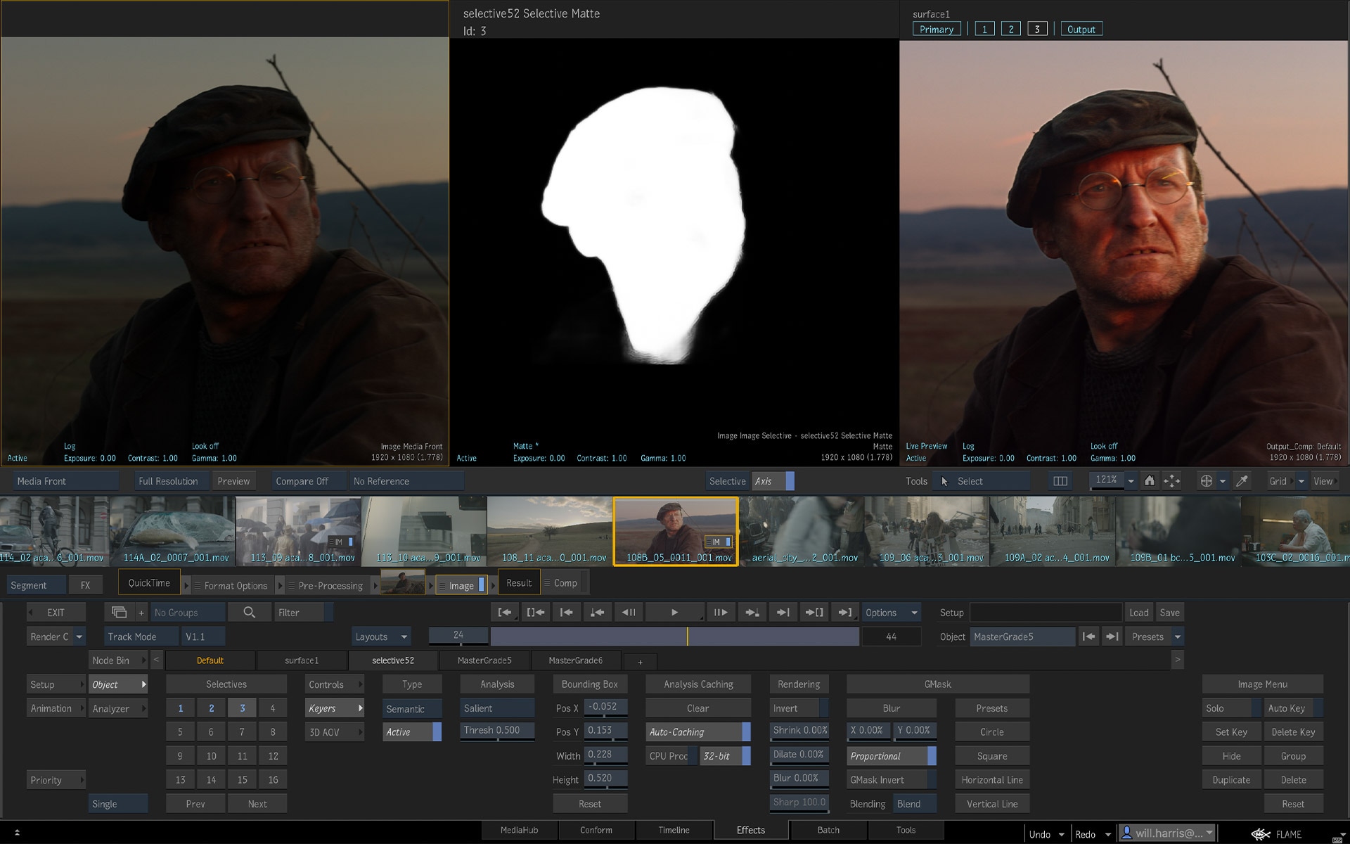 Save and recall color grading and FX work in a dedicated grade bin and reference comparison area.