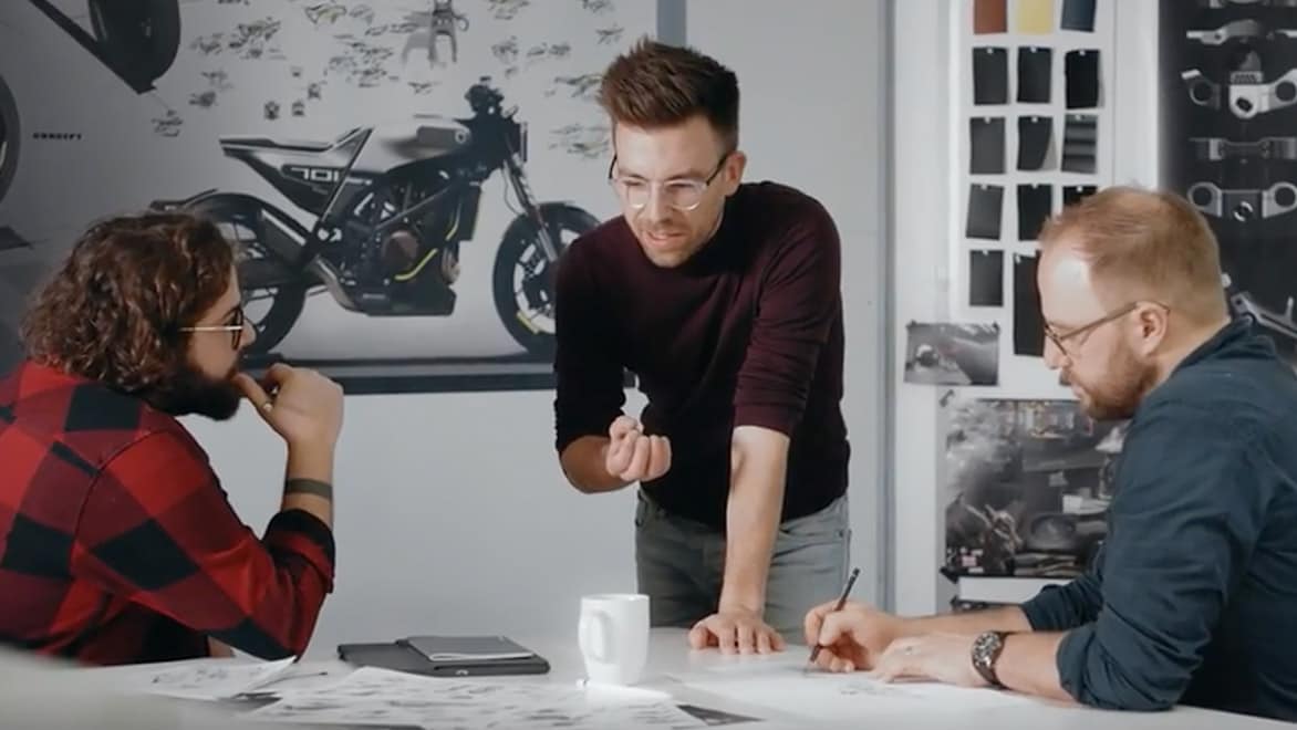 Design lead Craig Dent (center) reviews concepts based on the simplicity of the classic Husqvarna Silverpilen with his team.