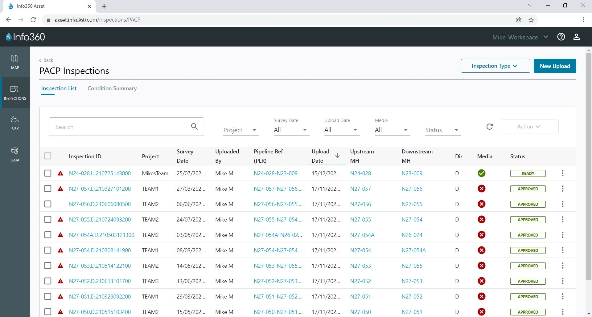 You can give your contractor direct access to the Inspection Portal in Autodesk Info360 Asset, where contractors can upload and review inspection data and media prior to submitting. Contractors can upload inspections without associated media so you can use the inspection data immediately and upload media later when the bandwidth improves. If inspections are not to your standards, you can reject them directly within Info360 Asset and explain why, so your contractor can re-inspect the relevant assets.