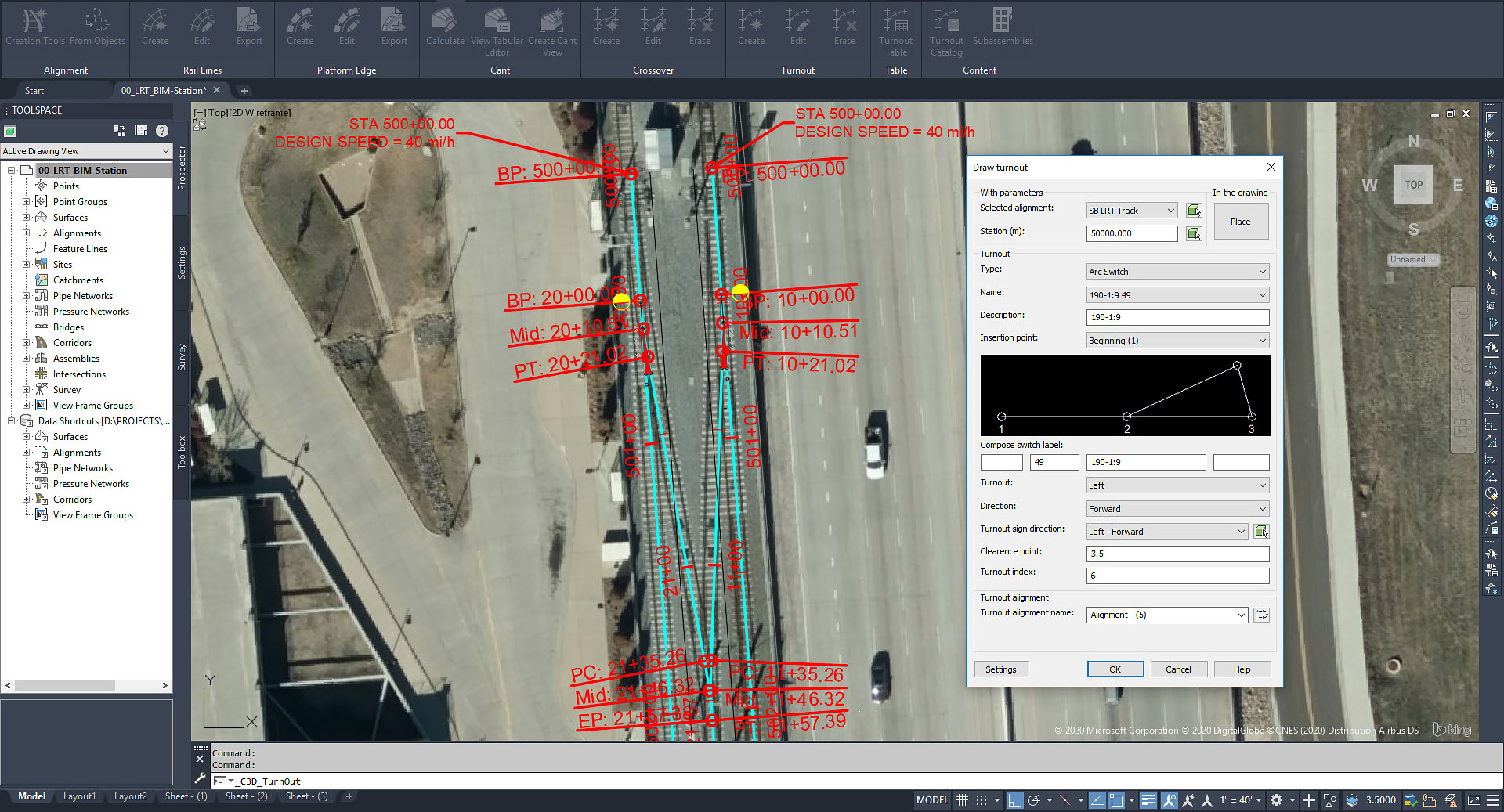 Build 3D track corridor models, including alignments, profiles, and assemblies. Incorporate designs for switches, turnouts, platforms, and calculations for cant. (video: 54 sec.)