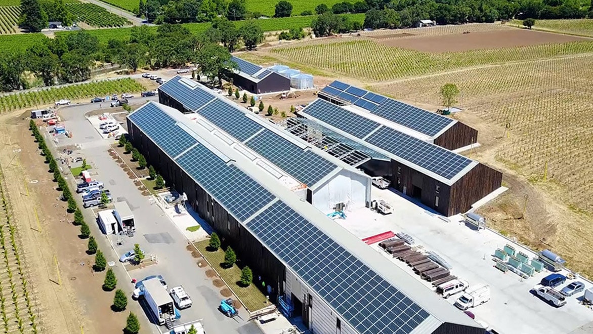 The entire western face of the winery and the tasting room is covered with solar panels, with the goal of enabling the facility to operate off the grid.