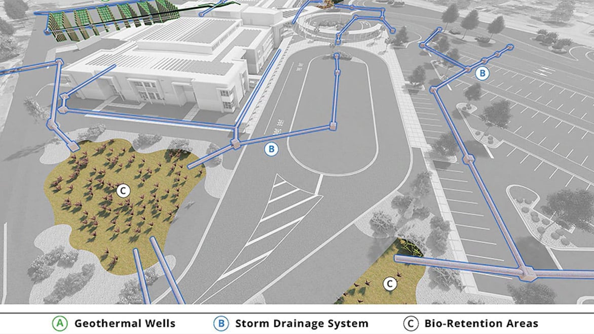 All five schools tap geothermal energy beneath their multipurpose playing fields. The 75 geothermal wells on each site are drilled to depths of 300 feet to transfer energy from the ground to the buildings.