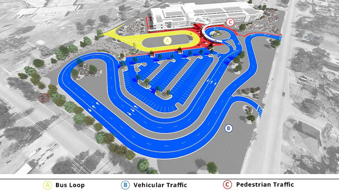 Project planners used Vehicle Tracking to analyze vehicle paths in relation to emergency equipment and bus traffic. They then designed a site plan, which provided an entry promenade with dedicated pick-up/drop-off loops that separate cars and buses. This prevents students from crossing traffic lanes and parking lots.